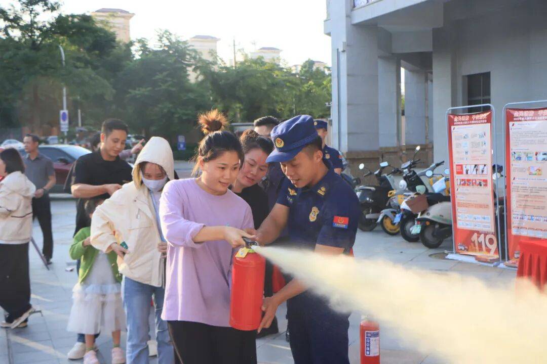 理论讲解结束后,进入实操体验环节。消防宣讲员现场示范了手提式干粉灭火器“提、拔、握、压”的正确使用步骤,强调“对准火焰根部使用”的核心要领,并邀请群众上手操作。“原来灭火器这么沉,之前只在电视上见过,现在亲手用了才知道关键在哪!”刚体验完的市民王阿姨说道。随后,宣讲员又详细演示了消火栓的开启方式、水龙带的连接技巧及角度控制,接着,宣讲员围绕消火栓操作展开详细教学,从阀门开启的力度控制、水龙带接口的精准对接,全程分步演示并讲解注意事项,确保群众清晰掌握应急供水灭火的核心流程与关键要点。